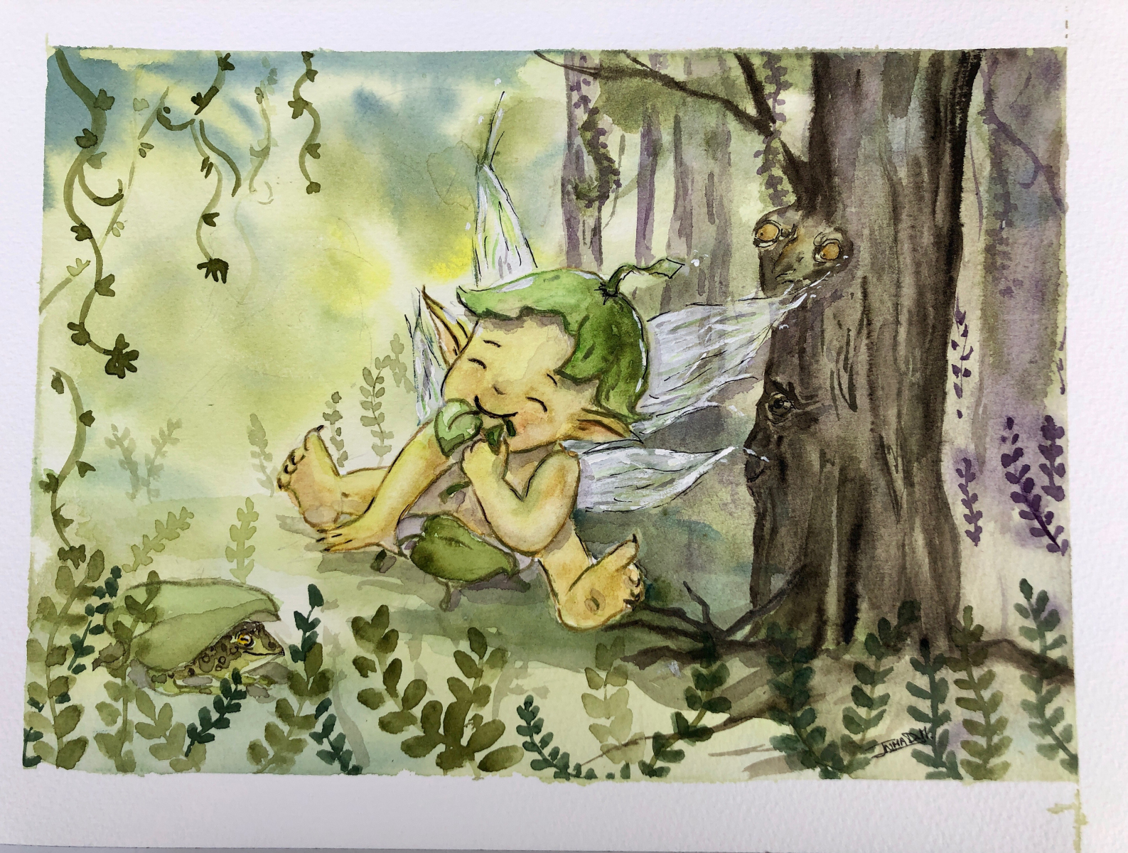 Talín merendando en el bosque. Acuarela y tinta sobre papel